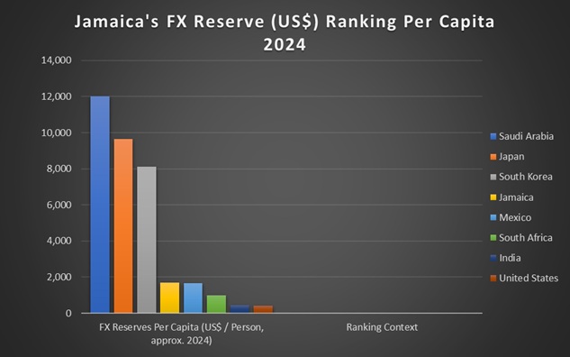 On a per-capita basis, Jamaica’s reserve holdings of approximately US$1,696 exceed several major world economies, placing it within the lower-middle range of the G20 nations.